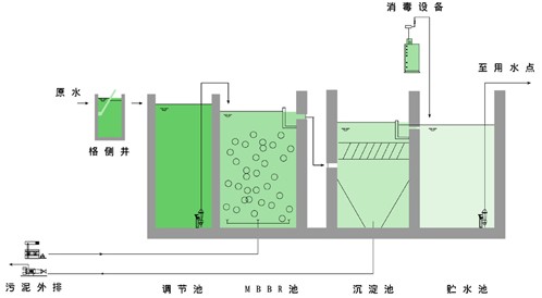 移动床生物膜反应器(MBBR工艺)吸收了传统流化床和生物接触氧化法两种工艺的优点,具有良好的脱氮除磷效果。污水连续经过MBBR反应器内的悬浮填料并逐渐在填料内外表面形成生物膜,通过生物膜上的微生物作用,使污水 得到净化。填料在反应器内混合液回旋翻转的作用下自由移动:对于好氧反应器,通过曝气使填料移动;对于厌氧反应器,则是用机器搅拌。