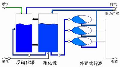 外置式膜生物反应器是将生物处理和膜分离技术有机结合的一种新型渗滤液处理工艺,MBR中的膜分离技术代替了传统的泥水分离技术(如二沉池),实现了水力停留时间和污泥泥龄的完全分离,通过膜分离的污泥回流,可以使反应器保持很高的污泥浓度(15-30g/l),渗滤液中难降解的污染物也能有效的降解;同时采用高效深水射流曝气,氧的利用率大幅度提高。