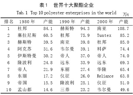 聚酯是化纤工业的重要原料,是由二元醇或多元醇和二元酸或多元酸缩聚而成的一类高分子化合物的总称。聚酯通常可分为饱和聚酯和不饱和聚酯2 大类,饱和聚酯产品主要有聚对苯二甲酸乙二酯(PET)和聚对苯二甲酸丁二酯(PBT)等,而不饱和聚酯产品主要有聚酯玻璃钢增强塑料等。世界聚酯市场分布不集中,世界10大聚酯企业占全球聚酯市场的比例超过三分之一,近20年来世界十大聚酯企业产能排行见表1 。
