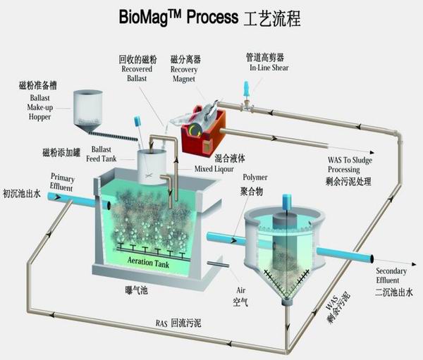 BioMag工艺是是继CoMag工艺之后推出的一项通过向生物絮体添加磁粉来提高污水生化处理的工艺。经BioMag工艺处理过的水,其悬浮物、生化需氧量、氮和磷的浓度都比较低,且所需的占地面积相对常规生化系统较小。BioMag工艺可以大大减小生物反应器的容积,显著降低去除BOD以及脱氮所需的占地面积。BioMag工艺的首要特点是,它在增加二沉池内的沉降速度和浓缩污泥层方面能力显著。对需要更大处理能力或者需要提高有机污染物去除能力的活性污泥处理厂来说,BioMag工艺是理想的选择。