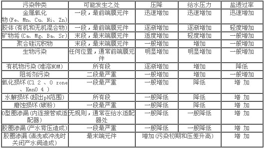 定时监测系统整体性能是确认膜元件是否已发生污染的基本方法。污染对膜元件的影响是渐进的,并且影响的程度取决于污染的性质。表1“反渗透膜污染特征及处理方法”列出了常见的污染现象和相应处理方法。