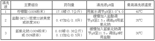 表2-常规清洗液配方提供的清洗溶液是将一定重量(或体积)的化学药品加入到100加仑(379升)的洁净水中(RO产品水或不含游离氯的水)。溶液是按所用化学药品和水量的比例配制的。溶剂是RO产品水或去离子水,无游离氯和硬度。清洗液进入膜元件之前,要求彻底混和均匀,并按照目标值调pH值且按目标温度值稳定温度。常规的清洗方法基于化学清洗溶液循环清洗一小时和一种任选的化学药剂浸泡一小时的操作而设定的。