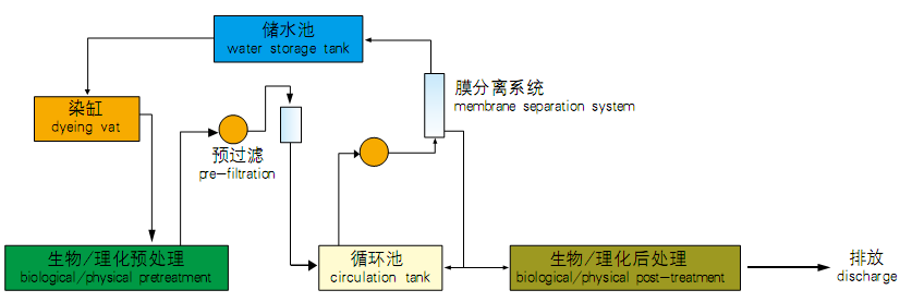 印染废水是加工棉、麻、化学纤维及其混纺产品为主的印染厂排出的废水,属难处理的工业废水之一,废水中含有染料、浆料、助剂、油剂、酸碱、纤维杂质、砂类物质、无机盐等。针对印染行业耗水量大、废水成分复杂、水质色度较高和中水回用有难度的状况,北京怡百信环境工程公司成功研发了印染废水处理及回用的技术工艺,该工艺能使处理后的回用水水质大大好于国家一级排放标准,并能实现50%以上的中水回用率,使回用中水直接用于生产之中,每年能够节约大量的新鲜水。在实现一级达标排放的基础上,削减排污总量70%以上。