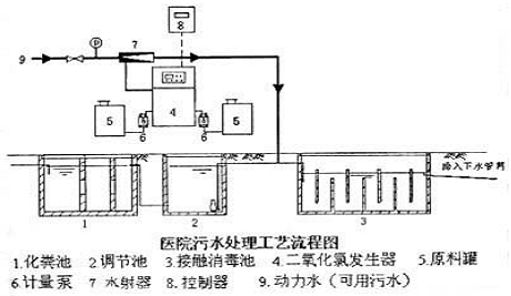 ●二氧化氯应用于医院污水的杀菌消毒的处理工艺流程图如下所示:
