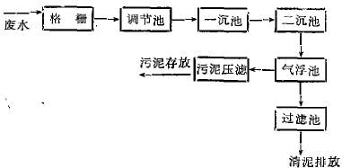 本地区某毛纺企业, 日排放印染废水400余吨, 为了在发展生产的同时消除污染,该企业投资60万元, 建成了一套日处理能力为1000吨废水的处理工商采用气浮法处理印染废水,于1991年10月正式投入运行。处理后水质经监测分析达到GB8978-88 污求综合排放标准》。