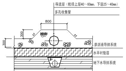 收集沟设置于导流层的最低标高处,并贯穿整个场底,断面通常采用等腰梯形或菱形,铺设于场底中轴线上的为主沟,在主沟上依间距30~50m设置支沟,支沟与主沟的夹角宜采用15的倍数(通常采用60),以利于将来渗滤液收集管的弯头加工与安装,同时在设计时应当尽量把收集管道设置成直管段,中间不要出现反弯折点。收集沟中填充卵石或碎石,粒径按照上大下小形成反滤,一般上部卵石粒径采用40~60mm,下部采用25~40mm。
