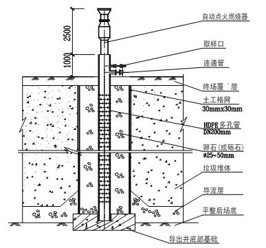 在填埋区按一定间距设立贯穿垃圾体的垂直立管,管底部通入导流层或通过短横管与水平收集管相接,以形成垂直-水平立体收集系统,通常这种立管同时也用于导出填埋气体,称为排渗导气管。管材采用高密度聚乙烯穿孔花管,在外围利用土工网格形成套管,并在套管上与多孔管之间填入建筑垃圾、卵石或碎石滤料,随着垃圾层的升高,这种设施也逐级加高,直至最终封场高度,底部的垂直多孔管与导流层中的渗滤液收集管网相通,这样垃圾堆体中的渗滤液可通过滤料和垂直多孔管流入底部的排渗管网,提高了整个填埋场的排污能力。排渗导气管的间距要考虑不影响填埋作业和有效导气半径的要求,一般按50m间距梅花形交错布置。排渗导气管随着垃圾层的增加而逐段增高,导气管下部要求设立稳定基础。典型的排渗导气管断面见下图。(蓝白蓝网)