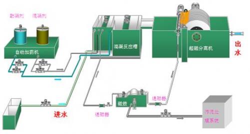 水中悬浮物一般不带磁性,微磁絮凝技术是在待处理的水中投加磁种,以此磁种为“凝核”,配合投加混凝剂和助凝剂,使非磁性悬浮物与磁种快速凝聚成微小的磁性絮团,在超磁分离机强大的磁力作用下与水分离。
