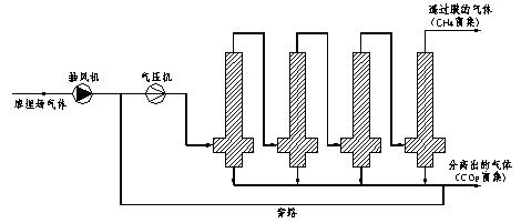 在气体渗滤过程中混合气体的分离是根据不同气体通过膜的速率各不相同而进行的。对于填埋场气体用传统的膜材料进行分离,氮气和甲烷气体的渗透性较差,而二氧化碳、氧气、硫化氢和水蒸气的渗透性较高。正是因为不同的渗透性,甲烷才能很容易的与二氧化碳分离。使处理后填埋气体中CH4含量达到96%左右。