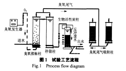 LF-20 型臭氧发生器;臭氧接触柱:不锈钢制,直径0.2m,高2.7m;生物活性炭柱:有机玻璃制,直径0.15m,高2.85m,炭层厚度1.5m,活性炭采用ZJ-15型颗粒活性炭;臭氧停留柱;尾气吸附柱。