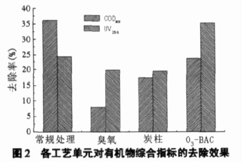 在研究过程中,用高锰酸钾指数(CODMn)、紫外吸光度( UV254)作为水中有机物的综合指标。试验期间,定期测量各工艺单元的进出水CODMn 和UV254数值,各工艺单元对有机物的平均去除率见图2。