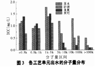 分析图2可知,常规工艺对UV254的去除率为25%。由于常规工艺对大分子量有机污染物去除效果明显,所以该现象说明UV254 的组成部分中有相当一部分是大分子物质。在深度处理过程中,与CODMn 的去除情况不同的是,臭氧和活性炭单元对UV254 都有一定去除能力,工艺出水UV254 降至0.081cm-1。首先,臭氧氧化能有效降低水中的UV254。臭氧的强氧化作用,可以使不饱和双键断开,苯环开环,从而使有机物的芳香性降低或消失,降低UV254值。而在炭柱中,UV254 的去除是活性炭吸附和生物降解两者共同作用的结果。一方面,活性炭易于吸附苯类化合物和小分子量腐殖质,对分子量在500~1000的腐殖质可吸附面积占其总面积的25%。另一方面,活性炭表面的生物膜可以降解分子量为500以下的有机物,胞外酶还可以降解分子量较大的有机物。