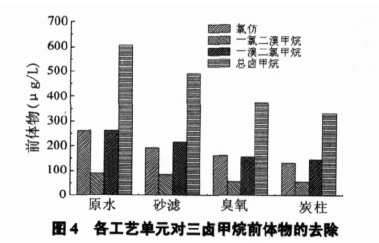三卤甲烷被认为是氯化形成的主要消毒副产物,我国2005 年实施的城市供水水质标准中规定三卤甲烷的质量浓度不能超过0.1mg/L。饮用水中检测到的三卤甲烷类消毒副产物共有4 种,即氯仿、二氯一溴甲烷、一氯二溴甲烷和溴仿。研究表明,三卤甲烷的各组分具有明显的致突变作用,且存在良好的剂量反应。本工艺采用的是后加氯,氯化过程中产生的消毒副产物直接进入给水管网,因此要在给水处理过程中减少其前体物。三卤甲烷生成势是指在水样中加入足够量有效氯,反应足够长时间生成的三卤甲烷总量,可以用来描述能够生成三卤甲烷的那一部分有机物。由于原水中溴的含量很低,所以溴仿的量一直低于检出限。由图4 可知,常规工艺对三卤甲烷前的其它各个组分都有一定的去除率,氯仿前体物为25%,一氯二溴甲烷前体物为9%,一溴二氯甲烷前体物为17%,总三卤甲烷前体物为19%。经过臭氧单元,三卤甲烷的各个前体物的总去除率达23%。生物活性炭对三卤甲烷前体物的去除率只有11%。有学者认为:原因是粒状活性炭对三卤甲烷前体物的去除主要依靠吸附作用,而炭柱内的活性炭运行一段时间后吸附能力明显降低。同时,藻类、有机物等的累积对去除三卤甲烷的前体物也有负面影响。