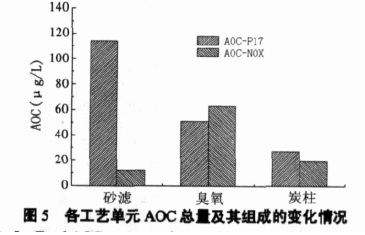 图5 数据显示,砂滤出水总AOC 为124μg/L,主要成分是AOC-P17,占91%。经过臭氧工艺,AOC总值变化不大,降为113μg/L,但AOC-NOX 的百分比迅速上升至55%。该现象说明:臭氧并不能大幅度降低水中AOC 值。相反有些实验结果显示在臭氧投加量较低的情况下,出水的AOC值会有不同程度的升高。虽然臭氧能将一部分有机物氧化成CO2 和H2O,但总体去除率很低。但臭氧对AOC两个组分的作用结果却不一样。它使AOC-NOX 显著增加,这是因为臭氧氧化有机物的中间产物多是螺旋菌NOX可利用的物质。而AOC-P17 反而降低,有学者认为可能是部分P17 菌种利用的营养基质被氧化,也可能由于NOX 的营养基质增加,增强了NOX 对这两种菌种交叉利用的营养物的竞争能力,使得AOC-P17 的值下降。