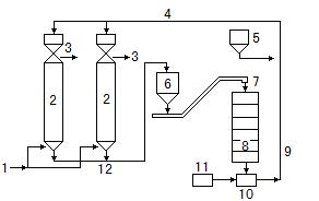 1、进水;2、移动床;3、出水;4、输炭管;5、新炭贮槽;6、饱和炭贮槽;7、脱水格网;8、再生炉;9、再生炭;10、再生炭贮槽;11、空压机;12、饱和炭(蓝白蓝网)