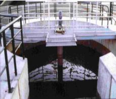 沉砂池主要由钢筋混凝土的池体和与其配套的搅拌部件、传动装置、气动提砂机构等组成。池体为圆形钢筋混凝土结构,底部是锥形的内腔与砂斗;池体上部置有电机、减速机、大小星形轮、转盘及装有立式浆叶的空心管主轴组成的旋转机构;空心管主轴中央为、进气管、提砂管组成的气动提砂系统。
