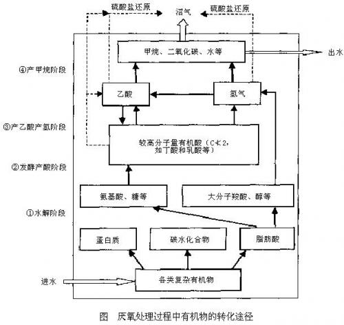 从生物化学和微生物学的角度,厌氧生物处理过程中有机物(尤其是复杂有机物——在废水中以悬浮物或胶体形态存在的高分子有机物)的降解途径可分为水解、发酵产酸、产乙酸产氢和产甲烷四个阶段(如下图)。