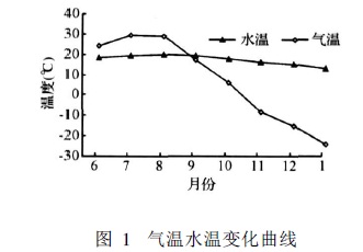 设计水温9-16℃。实测水温和气温变化如图1所示。相对于气温变化, 污水水温的变化不大。但是对微生物的活性来讲, 污水水温降低1℃ , 反应速度受到很大抑制。本次研究阶段为12月和1月,水温从17℃降到13℃。