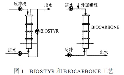 BAF 水流流向主要分为下向流和上向流,其中下向流以OTV 公司的BIOCARBONE 工艺为代表;上向流以OTV 公司的BIOSTYR 工艺为代表。BIOSTYR 和BIOCARBONE 工艺示意图见图1 。