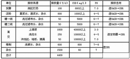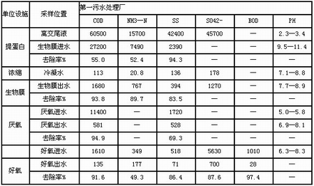 该厂处理的废水主要为离交尾液;淀粉、制糖中的有机废水,以及车间来的精制废水,洗柱水及其他杂水。具体水质水量见表1