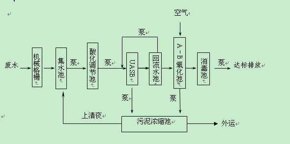 流程说明:来自厂区的生产废水及生活污水经管道收集流经格栅去除颗粒杂物后,排入集水调节池,然后由废水提升泵送至废水予酸化池,池中设潜水搅拌机进行搅拌,在池内经予酸化过程后,其水质保持相对的稳,20m3/d的酸化调节池出水由泵提升至UASB反应器进行厌氧消化,维持反应器中水温在240C以上,PH在6~8.5左右,采用池底均匀布水方式使物料与厌氧颗粒污泥得以充分接触,经三相分离器分离后的厌氧消化液进入回流水池后,部分与未经UASB处理的予酸化出水混合后回流至UASB,部分排入A-B反应池进行好氧生化处理,上清液排入消毒池,进行氯片消毒,达标外排。UASB剩余污泥排到污泥贮池贮存,上清液回流至集水池。A-B池产生的剩余污泥定期排到污泥浓缩池,浓缩后污泥外运。