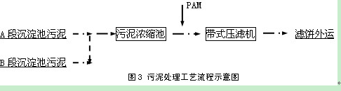 污泥处理系统作为后处理在生物处理系统运行正常后开始运行。调节沉降罐沉淀下来的蛋白全部回收到车间,AB段沉淀池的部分污泥及段沉淀池的污泥进入污泥浓缩池进行浓缩后进入带式压滤机压滤脱水后,泥饼外运填埋,污泥浓缩池的上清液及带式压滤机的滤液返回预酸化池进行处理。
