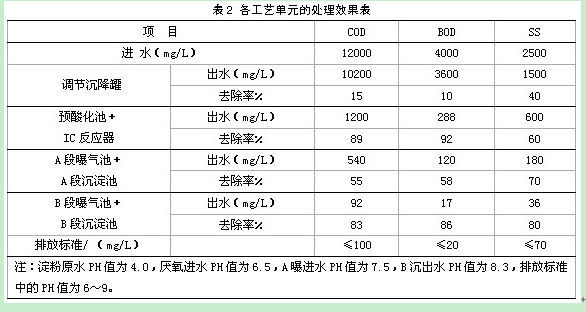 由于本工程设计的IC反应器负荷较高,污泥的接种是从同类型行业接种的运行较好的厌氧颗粒污泥,接种量为600 m3,在接种前首先向反应器内注入1000 m3清水,然后开始加温使反应器内的温度达到35℃左右,然后将接种的600 m3的颗粒污泥用转速较低的螺杆泵打入反应器内,并开启循环系统进行内循环,让接种的颗粒污泥逐渐的恢复活性,此阶段用时三天左右,然后开始提高负荷首先将进水COD浓度控制在2500±300mg/L,进水量为200m3/h,运行负荷为8kgCOD/m3.d,此阶段运行用了8天的时间然后依次运行负荷至9.6 kgCOD/m3.d(进水COD为3000±300mg/L,进水量为200m3/h,用时15天)、11.2 kgCOD/m3.d(进水COD为3500±300mg/L,进水量为200m3/h,用时5天)、14.6 kgCOD/m3.d(进水COD为3500±300mg/L,进水量为260m3/h,用时10天),直至达到设计16.6 kgCOD/m3.d(进水COD为4500±300mg/L,进水量为260m3/h,用时8天)一共调试了50天左右。在运行的过程中反应器内的温度一直控制在36℃~38℃,进料温度控制在38℃~40℃,由于厌氧过程中产甲烷菌最适宜的PH值范围为6.5~7.2,过高或过低都会都会影响产甲烷菌的活性,虽然原水的PH值在4.0经过回流水稀释后,PH值基本在6.5左右。具体参见http:更多相关技术文档。