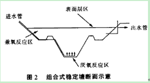 组合式稳定塘的工作原理是:从微生物类属来看,塘分为3种微生物反应区。即厌氧反应区、兼氧反应区、好氧和藻类生长区。详见图2组合式稳定塘断面示意。