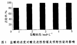 用盐酸改性后的粉煤灰对铁的去除率都很高,当盐酸的浓度为3mol/L时去除率最大,达98.5%(以下实验均选用3mol/L盐酸改性的粉煤灰)。