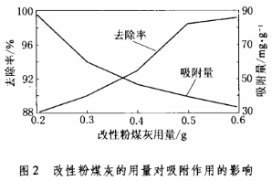 (2)向5个装有100ml、含Fe³?浓度为20mg/L的模拟废水中,分别加入不同量的改性粉煤灰,考察改性粉煤灰的用量对铁去除率的影响,结果如图2所示。随着吸附剂用量的增大,对铁的去除率也随之增大,吸附量不断减小。当改性粉煤灰的用量为6g/L时,对铁的去除率高达99.2%。但从吸附量看,当改性粉煤灰的用量为2g/L时,吸附量最大,其值为88mg/g。