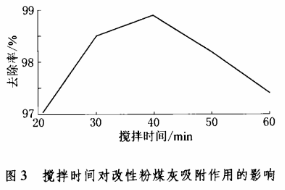 (3)在5个250mL烧杯中各加入含铁浓度20mg/L的模拟废水100ml和改性粉煤灰0.5g,考察搅拌时间对铁去除率的影响,结果如图3所示。改性粉煤灰对铁的吸附在40min时已达到平衡,其后因解吸而去除率降低。但吸附30min和40min后的去除率差别不大(由98.5%增加到98.9%),从经济的角度考虑选择吸附30min更为合理。