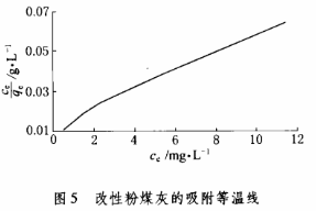 (5)在5个250ml烧杯中各加入0.5g改性粉煤灰,再加入不同浓度的含铁废水(25℃),考察25℃时改性粉煤灰的吸附性能,改性粉煤灰的吸附等温线如图5所示。