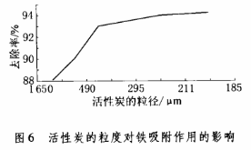 (1)向5个250ml烧杯中分别加入0.5g的不同粒度的商品活性炭,各加入100ml含铁浓度为20mg/L的模拟废水,考察活性炭的粒度对铁吸附作用的影响,结果如图6所示。