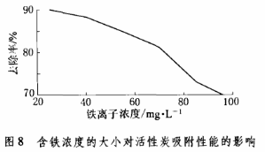 (3)在100ml含铁浓度不同的模拟废水中分别加入0.5g的活性炭,考察含铁浓度的大小对活性炭吸附性能的影响,结果如图8所示。