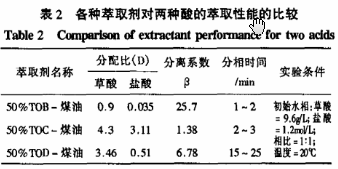 以草酸的分配比及草酸与盐酸的分离系数为衡量标准,进行了萃取剂筛选试验,其结果如表2所示。