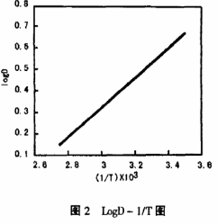 温度是萃取过程不可忽略的重要因素,在不同的萃取温度下,相比为1:1条件下,12g/L草酸溶液和由50%TOB+45%煤油+5%2-乙基己醇组成的有机相进行了萃取平衡实验,其试验结果如图1所示。从图1中可以看出,随着温度的升高分配比下降,温度降低虽然分配比较大,但分相时间较长。因而萃取温度应为20℃-30℃较合适,将分配比的对数值对温度的倒数1/T作图,我们可得到如图2所示结果。
