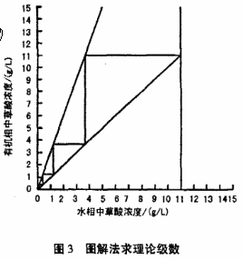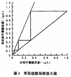 首先根据实验数据绘出萃取等温线y=f(x),y表示有机相中草酸的浓度,x表示水相中草酸的浓度,其次根据已知被萃草酸在萃余液中的浓度和相比可绘出操作线,在此两直线之间作折线,结果如图3所示,萃取级数的局部放大图如图4所示。具体参见http:更多相关技术文档。