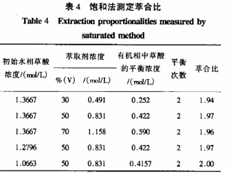 用饱和法研究萃合物的组成,是基于被萃物在有机相中达到最大限度的饱和值,以确定萃取剂与被萃物的分子数的比值,即为萃合物的组成。实验方法:将不同浓度的萃取剂与不同浓度的草酸溶液平衡数次(2-3次),使其达到平衡,分析有机相的组成,计算萃合比。在温度25℃,相比1:1条件下的实验研究结果如表4所示。