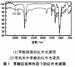红外吸收光谱研究萃取机理目前使用比较广泛,不同的基团在红外光谱中有不同的频率,它不仅可以分析化合物的生成,而且可以确定键的性质,为了揭示草酸与有机相的作用机理,利用红外光谱测试研究了水溶液中和有机相中的草酸红外光谱图谱的变化规律。红外光谱测定结果如图5所示。