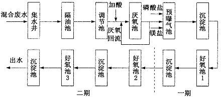 厌氧池采用新型复合厌氧系统,特点是上部装填填料,下部设置污泥床层,结合了上流式厌氧 污泥床反应器( U A S B ) 与厌氧滤池 ( A F ) 两者优点;通过池内多点布水,外加出水循环,加强了泥水间传质,又防止了微生物的外流,提高了反应器内污泥浓度。厌氧处理 目的是在降解易生物降解有机物的同时,使难降解有机物解体、被取代或裂解( 降解) ,以提高可生化性,利于后续的好氧处理。由于混合废水中有机胺成分高,厌氧处理后出水氨氮浓度升高,有效去除氨氮是工艺的关键。设计采用先向厌氧出水投加镁盐和磷酸盐,生成磷酸氨镁沉淀去除部分氨氮,再通过后续好氧段良好的硝化反应,使氨氮达标排放。后续的好氧 系统分成相互独立的三部分,其中作为一期的第一部分采用高浓度活性污泥法,第二部分采用接触氧化法,第三部分采用移动床生物膜反应器( MB B R ) 法,构成前段活性污泥法后段生物膜的处理工艺。首先利用了高浓度活性污泥 比表面积大、微生物与有机物接触充分、利于处理较高浓度污染物的特点,作为初步降解段;后端使用生物膜法,利用生物膜的污泥龄长和微生物丰富的特点, 使生物膜在低基质浓度可以获得较活性污泥更好的效果, 从而使好氧处理各个部分都得到了合理利用。