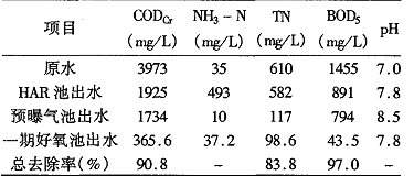 l I A R池利用原来的 A1 、A 2池进行改造,有效面积为 1 6 0 m 2 ,有效容积为 1 0 2 6 m 3 ,设计容积负荷N v :2 k g C O D /( m 3 - d ) ,水力停留时间 H R T=5 0 h ,反应器有效水深为 6 .5 m,填料层与污泥层高度比为5: 2。 污泥培养驯化于 4月5日开始,接种污泥为某污水厂剩余污泥,接种量为 1 8 0 t ( 污泥含水率8 5 %) 。污泥投加采用集中投加方式,培养采用先间歇进水培养后连续进水培养的方案。期间控制进水 p H在 7 .0左右,并适当补充些营养元素( 主要是磷) 和微量元素( 如 C a 2 、M 等) ,结合厌氧回流泵的使用,根据出水情况逐步提高负荷,经历3 个月左右时间,到7月中旬反应器内出现小米状颗粒污泥,标志着H A I l 池启动完成。启动后 C O D平均去除率保持在 5 1 .5 5 %,有机胺转化率稳定在5 7 .1 3 %,沼气产量3 9 0 .1 5 m 3 /d ,产气中C H4、C O 2含量平均保持在 5 9 .8 6 %与 11.9 3 %。