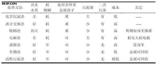 表1-1 电镀废水处理方法的比较