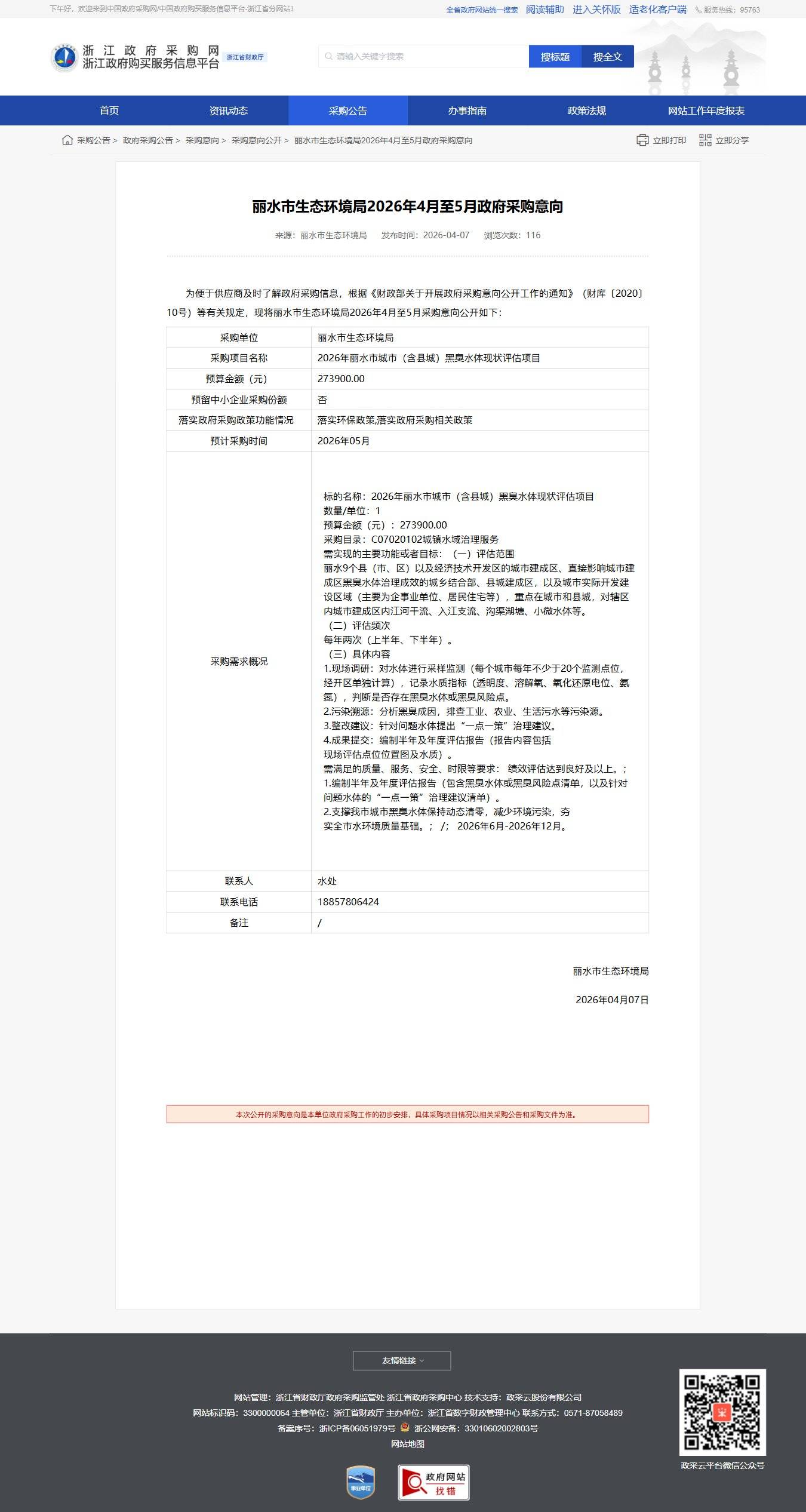 浙江丽水市生态环境局2026年4月至5月政府采购意向公告