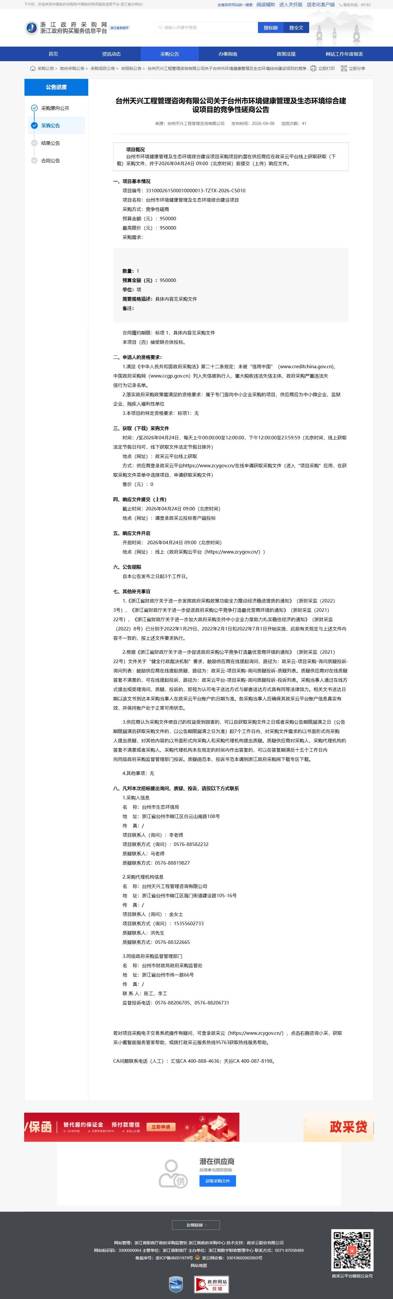 浙江关于台州市环境健康管理及生态环境综合建设项目的竞争性磋商公告