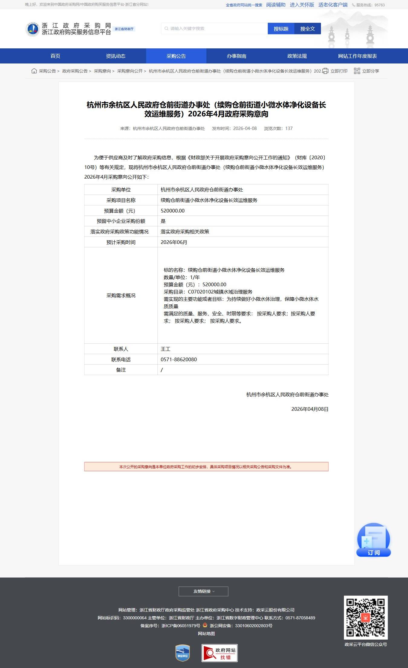 浙江杭州市余杭区人民政府仓前街道办事处(续购仓前街道小微水体净化设备长效运维服务)2026年4月政府采购意向公告