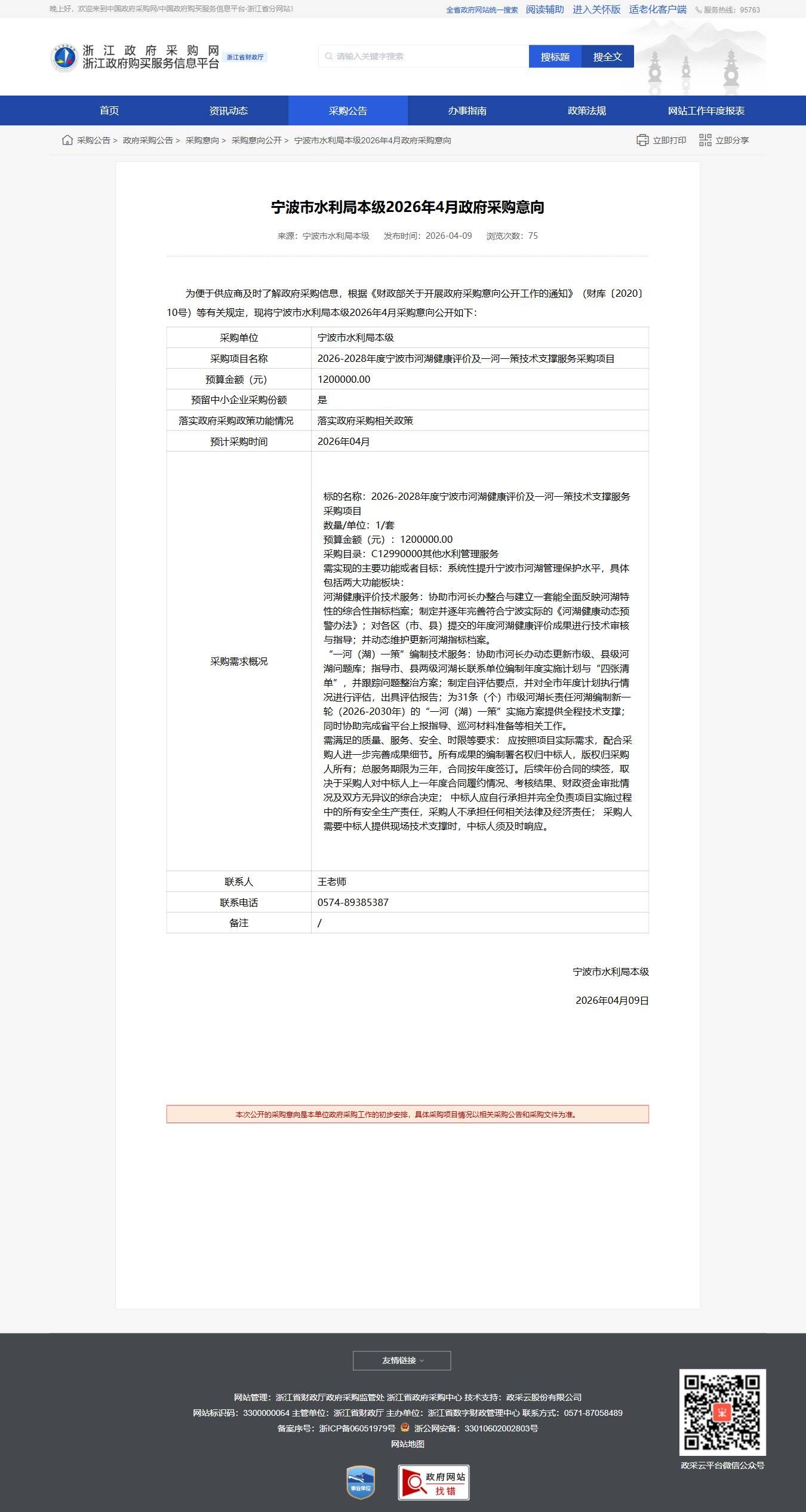 浙江宁波市水利局本级2026年4月政府采购意向公告