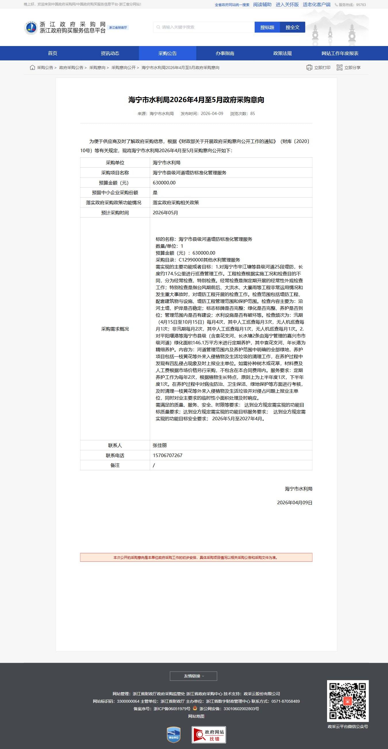 浙江海宁市水利局2026年4月至5月政府采购意向公告