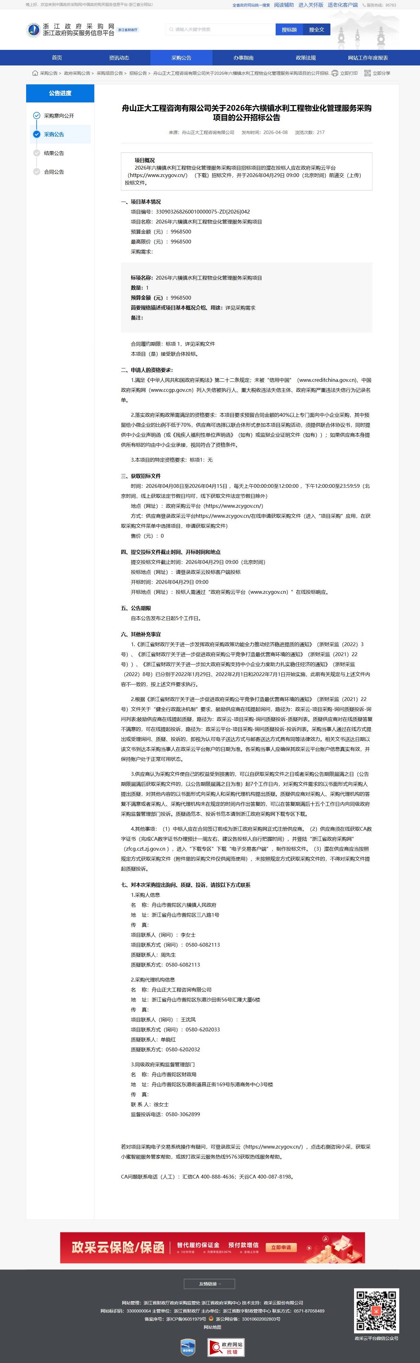 舟山市普陀区六横镇人民政府发布2026年六横镇水利工程物业化管理服务采购项目公开招标公告,公告内容如下: